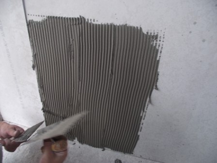 清除瓷磚背面油污、灰塵的雜物,用齒型刮刀將瓷磚粘結劑抹于基面上。使之均勻分布在基面上,并成一條條齒狀,每次約涂抹1㎡